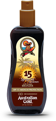 Opalovací gel ve spreji s přidanou složkou Bronzer, k dispozici s ochranným faktorem SPF 6, 10, 15, nebo 30. Rychle se vstřebává a bezpečně chrání vaši pokožku před UVA i UVB zářením. Obsahuje bronzer na bázi karamelu, který dodává okamžité opálení. Olivový olej, Aloe Vera a australský Tea Tree Oil pokožku zklidňují a vyživují.